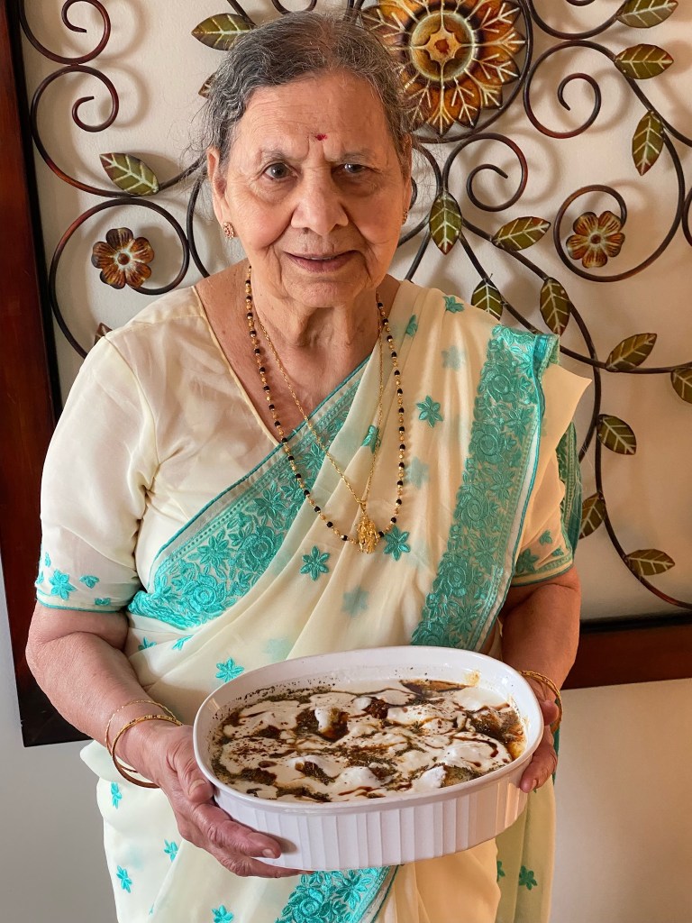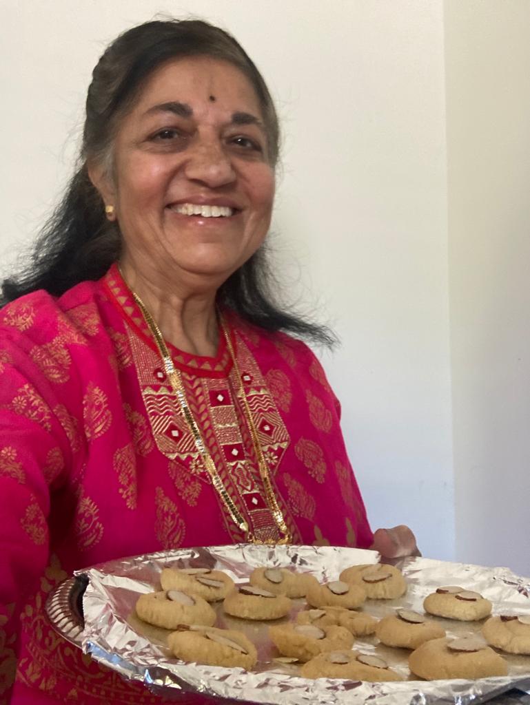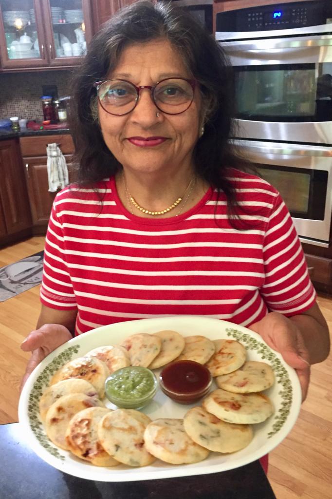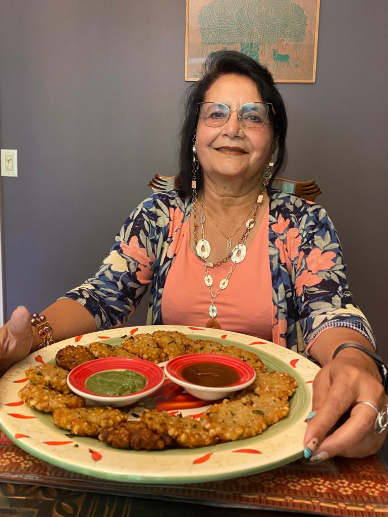 Santosh Jhanjee is an erudite published poet of evocative Hindi poems of meaningful beauty. Santosh came to the US in 1985 with her husband and two teenage sons and $20 in her pocket. Today she lives an independent life on her own terms, surrounded by many friends and a loving family that includes 2 doctor sons, 4 grandchildren and sisters. As an accomplished cook, her feast of delights features 3 of her favorite recipes: Mathri, Halwa and Daal Paratha.