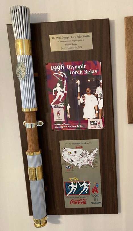 If Prakash had selected the centennial Olympic torchbearers himself, they would be as noble and accomplished as Martin Luther King Jr. or Mahatma Gandhi. Instead, after a nomination by his young sons, he was chosen by the United Way (in recognition for a lifetime of volunteerism and embracing the Olympic spirit), to be one of 34 local community heroes to carry the flame for a 2/3 mile distance through the Twin Cities, before it went on its way to the Atlanta Olympics in 1996.