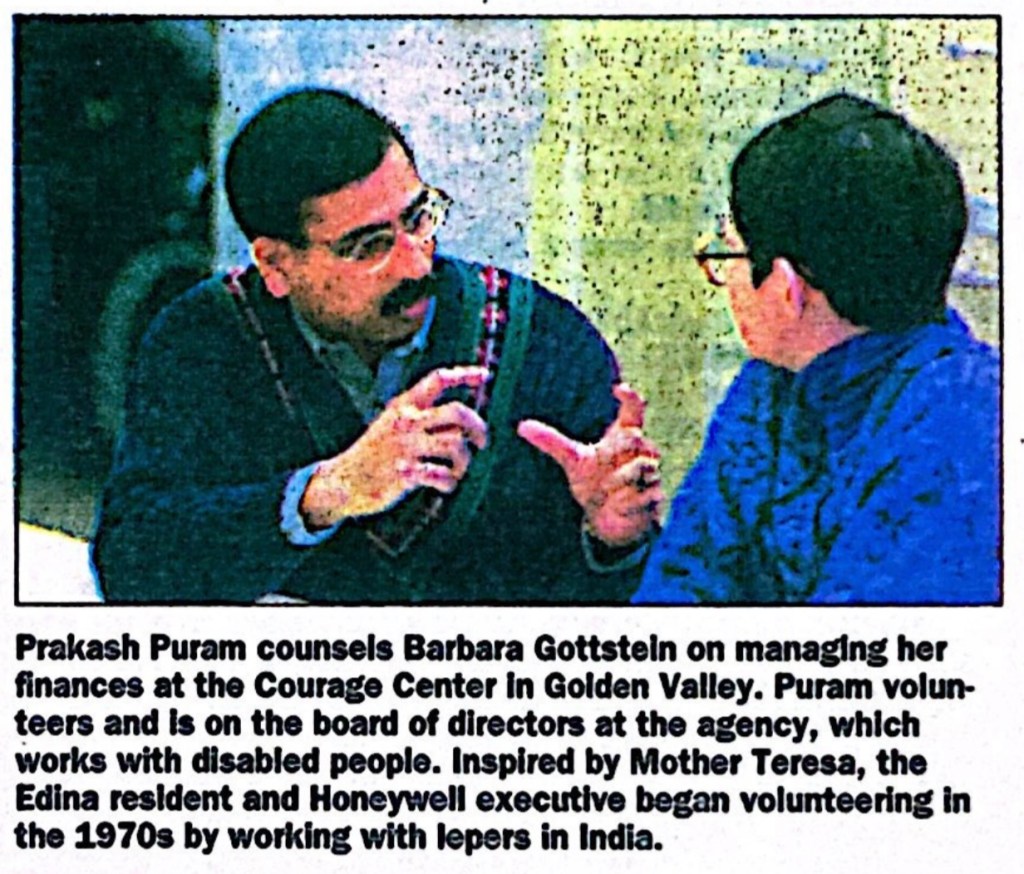 With Mother Teresa prodding his conscience, Prakash volunteered at Courage center in the Twin Cities, an organization that provides service to 20,000 disabled people,. He took clients shopping, to the movies, made tie-dyed T-shirts and played basketball with them. He became a Board member and was named Chairman of the Public Policy committee, lobbying on behalf of disabled people in the Minnesota state legislature. He also sent money to leper homes in India, volunteered with Meals on Wheels, the Special Olympics and Storefront/Youth action, an agency that provided counseling programs and violence prevention for suburban youth.